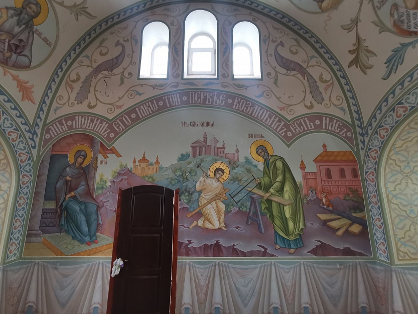 Центральное место на хорах занимает фреска, где изображен юный Иисус, Который трудится с Иосифом, помогая ему в плотничьих делах. Неподалеку от святого семейства на досках сидит рыжий котенок. Этот персонаж уже стал героем одной из фресок Христорождественского храма — «Иисус Христос благословляет детей». Там кот гораздо старше, он уже большой и толстый. Такую художественную параллель задумал настоятель храма священник Александр Шумилов, а воплотил в жизнь иконописец Илья Шимонаев и его коллеги, сообщает сайт Курганской епархии.