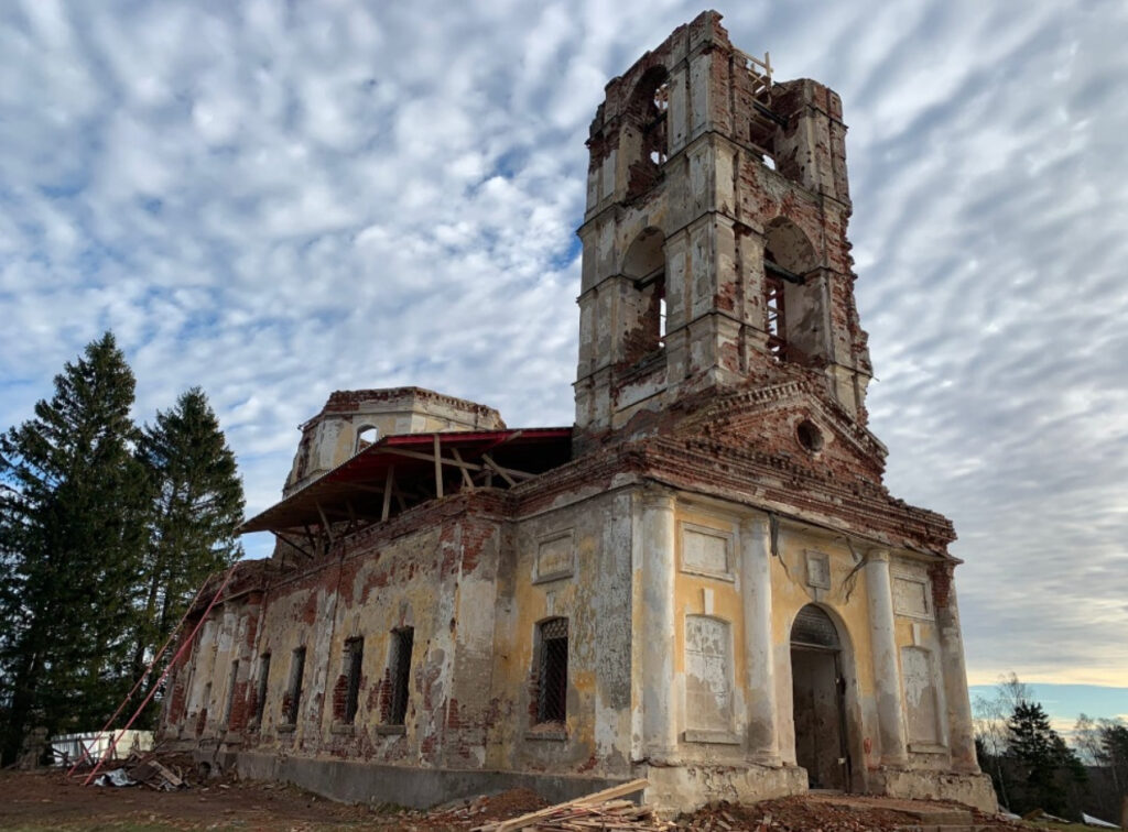 В начале октября над трапезной, храмовой частью и колокольней Никольской церкви завершилась установка деревянных укрытий.