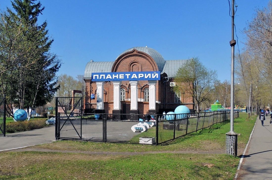 Здание, в котором ныне расположен планетарий, первоначально было Крестовоздвиженской церковью при одноименном загородном кладбище. Храм был освящен в 1909 году. В 1932 году решением Западно-Сибирского крайисполкома он был закрыт, а здание передано под избу-читальню районной библиотеки. Тогда же было принято решение о закрытии кладбища и превращения территории в сад культуры и отдыха имени Ударников. Сейчас первоначальный интерьер храма утрачен, на западном фасаде заложен оконный проем. В 1950 году были разобраны глава и барабан купола церкви. В том же году в помещении открылся планетарий. В 1960 году прошла еще одна реконструкция: у южного фасада появилась пристройка с декоративной колоннадой.
