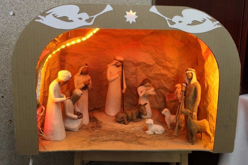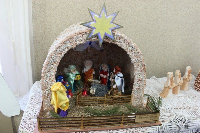 Были представлены работы из самых разных материалов. У каждой из них – своя история. Например, дочь и мать Екатерина и Валентина Строковы три месяца ездили в дивеевскую народную студию «Параскева», где учились искусству лепки из глины. В итоге их керамический вертеп с фигурками не уступает работам дивеевских умельцев. А молодая семья Степушкиных сооружала вертеп по ночам, так как двое деток еще маленькие. Мама связала фигуры, а отец облицевал пещеру мраморной крошкой и провел электрическое освещение. Открытием этого года стали рождественские и, одновременно, пасхальные работы: на них изображен вертеп, но присутствуют веточки вербы и яйца.