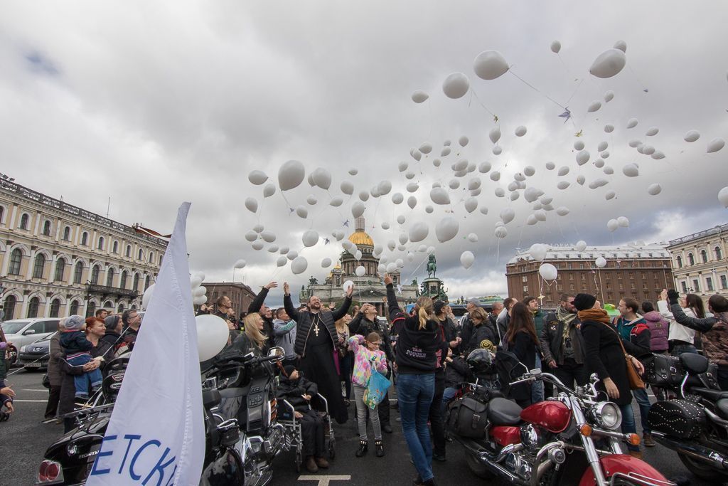 От Исаакиевской площади организованная колонна на мотоциклах с флагами хосписа выдвинулась к храму святого апостола Петра. Возглавлял ее отец Александр.
