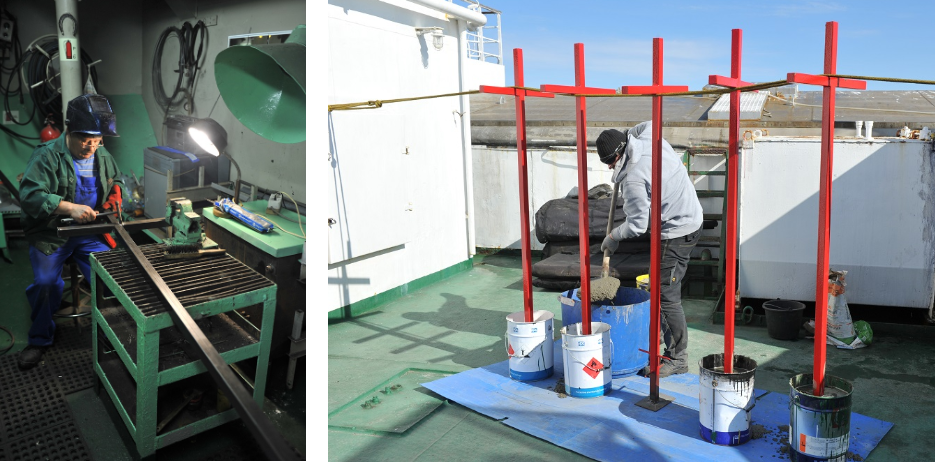 Кресты для приметных гуриев изготавливались командой под чутким руководством боцмана. Руководитель экспедиции М.В. Флинт перед выходом в море, руководствуясь советом архипастыря, взял нужные материалы на борт судна. В мастерской изготовили кресты и покрасили их в алый цвет, дабы были приметны на большом расстоянии. В дни, когда наблюдался штиль, кресты закрепили в специальных конструкциях-основаниях (шестидесятикилограммовых бетонных цилиндрах) с тем, чтобы обеспечить надежное утверждение в сланцевой кладке гурия.