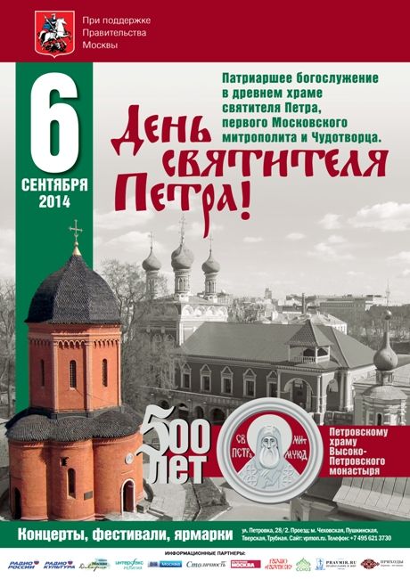 6 сентября 2014 года, в рамках торжеств в честь Дня города, в Москве впервые пройдет городской праздник «День святителя Петра — Москва Петровская», посвященный памяти святителя Петра, митрополита Киевского, Московского и всея Руси, основателя Высоко-Петровского монастыря. В этом году исполняется 500 лет со дня строительства древнейшей из сохранившихся церквей Высоко-Петровской обители – храма Петра Митрополита. Святейший Патриарх Московский и всея Руси Кирилл утром 6 сентября совершит ее великое освящение и Божественную литургию.