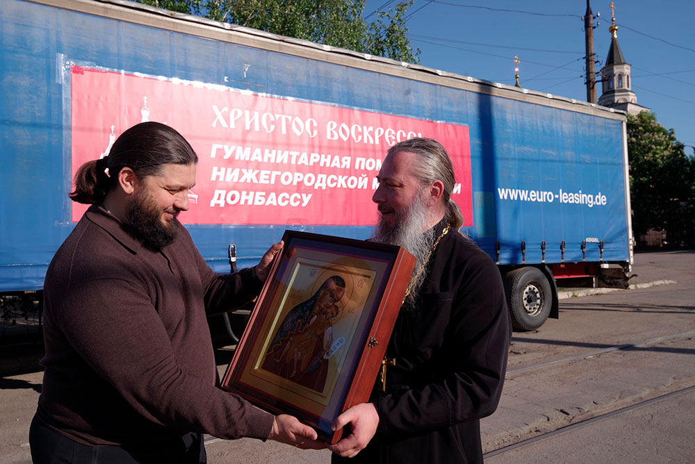 Разгрузка машин с гуманитарной помощью шла три часа. Среди помощников было два совсем пожилых мужчины. Невзирая на явные трудности с передвижением, они помогали, как могли. Много было и подростков-мальчишек. И во главе этой шумной и веселой (шутки сыпались направо и налево) братии – батюшка. Протоиерей Александр Брянцев родился в Горловке, служит здесь с 2004 года. Все самые тяжелые времена пережил вместе с паствой. От имени митрополита Горловского и Славянского Митрофана поблагодарил Нижегородскую митрополию и лично владыку Георгия за оказанную гуманитарную помощь: