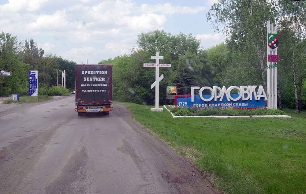 Проезжаем Иловайск, Харцызск, Енакиево, вот и Горловка. Не отрывая глаз от дороги, ищу подтверждения обстрелов. Ничего нет: дома как дома, кое-где требующие ремонта. Дороги не очень, а по ним еще и тяжелая техника ездит – следы гусениц видны на асфальте. Жительница Донецка Александра, которая встречала нашу колонну на границе и сопровождала ее в течение всей нашей поездки, позже мне объяснила: «Вам картинку смазывает лето: природа прикрывает те нюансы, которые вы могли увидеть. Иловайск разбомбили до основания. По Енакиеву тоже долетало буквально на прошлой неделе. Донецк каждый день бомбят, как и Горловку». Но местные власти стараются быстро реагировать на обстрелы и по возможности убирать их последствия.