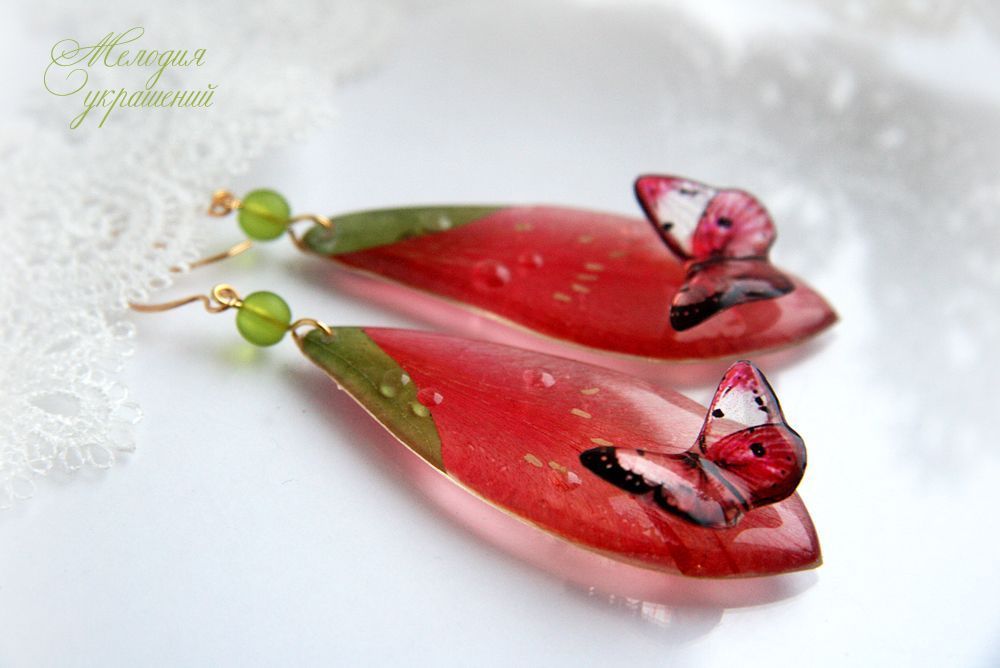 Был очень волнительный момент, когда я решила выкладывать свои изделия на суд публики в «Живом журнале». Я очень долго к этому готовилась. Думала: сейчас куча народу увидит и начнут обсуждать. Сфотографировала, выложила. Естественно, никакого шума не было. Первые украшения были из натуральных камней, из жемчуга. Потом украшения из ткани. И постепенно я пришла к материалу, с которым работаю сегодня, – к ювелирной смоле и прозрачным украшениям из нее. Я до сих пор делаю что-то из камней, но украшения из лепестков и листьев — мои самые любимые. Стараюсь их постоянно усовершенствовать.