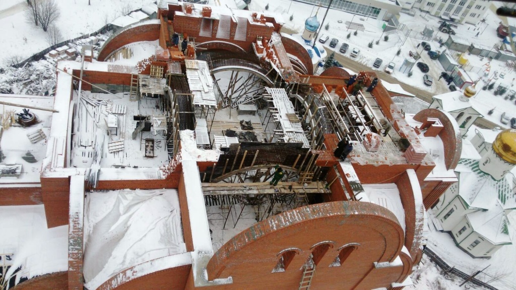 Когда заливали бетонный цоколь – непрерывно, с двух насосов, было особенно важно отсутствие заморозков. При заливке алтарной стены было от 5 до 9 градусов тепла – и это в декабре.