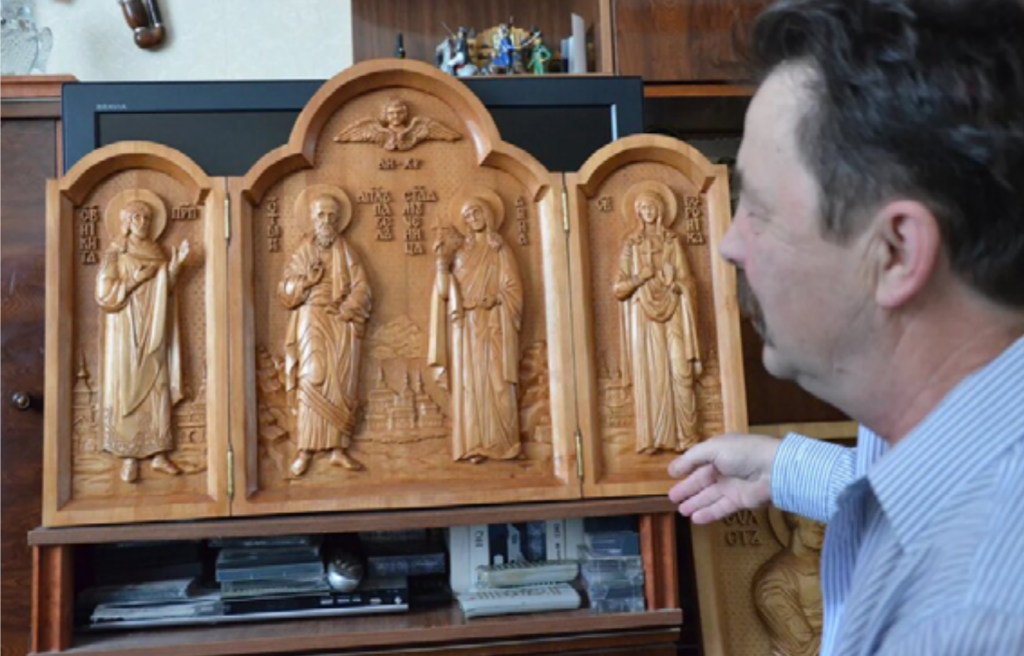 Валерий не только реставрирует, ни и сам создает иконы. Необычные – резные! На Русском Севере издавна существовала традиция деревянных резных изображений. «Иконы на рези» пришли на Русь из Византии еще в XI столетии, но в XVII веке их сочли пережитком язычества и влиянием католичества и вместе с резными деревянными скульптурами начали запрещать. На Русском Севере, на Урале и в Сибири резные иконы по-прежнему пользовались особой любовью народа.
