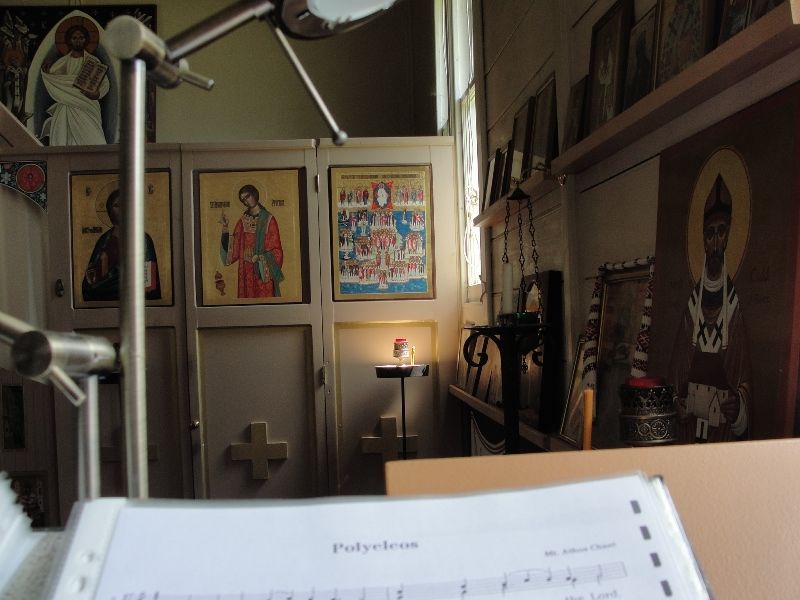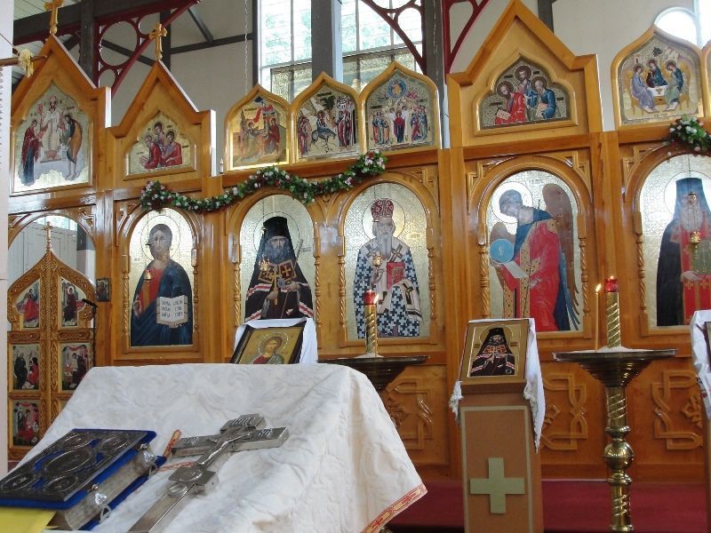 Иконостас мы заказали в Молдавии, мастера в Кишиневе работали над ним. Наряду с изображениями Спасителя и Божией Матери там есть икона святителя Иоанна Шанхайского и Сан-Францисского, который несколько лет управлял британскими приходами. Рядом с ним – святитель Николай Сербский (Велимирович), который скончался в год моего рождения. Они были друзьями, у нас есть их переписка. С другой стороны, после Архангела, здесь есть Алексий Карпаторусский, и он тоже был другом святителя Иоанна. Он был архимандритом в Закарпатской Руси, вернул 160 тысяч человек из унии в Православие. Они все переписывались. Преподобный Алексий скончался в 1947 году, Николай Сербский – в 1956 году, владыка Иоанн – в 1966-м. В иконостасе есть образ равноапостольного Николая Японского, который скончался в 1912 году. Его владыка Иоанн тоже очень почитал.