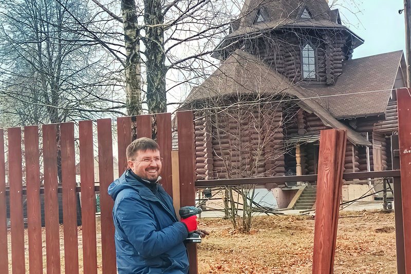 Да, именно комплекс. Ведь здесь не просто одна церковь стоит в голом поле. Хотя и ее вид сам по себе очень впечатляет: храм в древнерусском стиле, массивный, сложенный из толстых бревен. Рядом – большая детская площадка, длинная беседка. Все из дерева. Площадь территории – полтора гектара, и на ней явно работы не прекращаются: повсюду лежат строительные материалы. А вот и двое мужчин активно орудуют инструментами – доводят до ума песочницу. Здороваюсь и спрашиваю: «Где батюшку можно найти?» А они: «Так он там, забор делает».