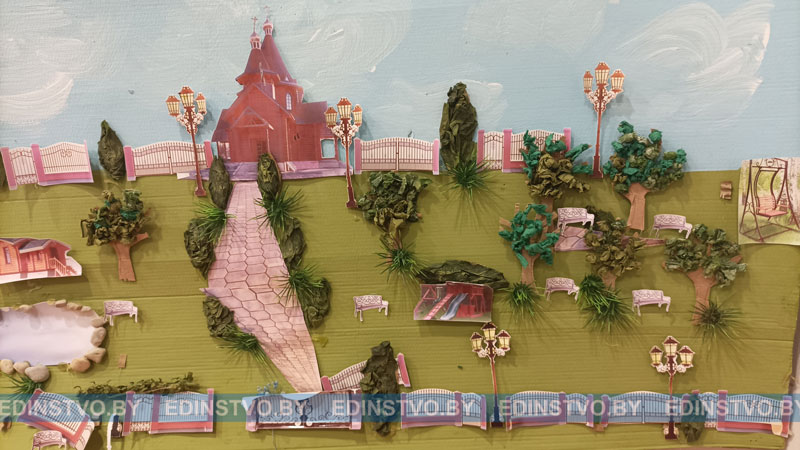 Внимание привлекает большой коллаж: дети изобразили на нем то, какой видят в будущем территорию возле храма. На картине с объемными элементами есть и озеро, и сад, и мощеные дорожки, и качели. Отец Павел говорит: будем воплощать детские мечты в жизнь!