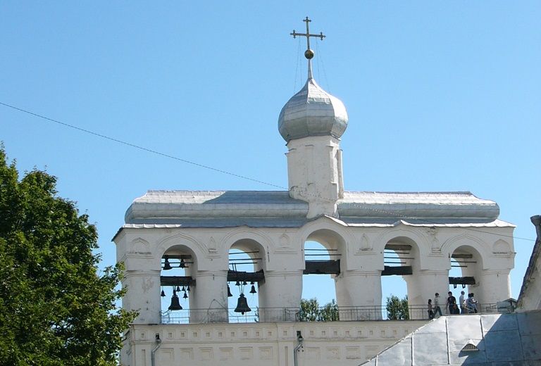 После революции Новгороду повезло. Здесь был очень сильный музей, и он сумел отстоять хотя бы часть древних новгородских колоколов. То, что мы сейчас видим перед звонницей, то, что могут увидеть посетители музея внутри звонницы, было сохранено от уничтожения в 1920 – 1930-е годы, а также пережило период немецкой оккупации. В 1941 году колокола Софийского собора были сняты со звонницы и подготовлены к эвакуации. Многим новгородцам известна история с баржей, когда ее подбили с уже погруженными большими колоколами во время налета немецкой авиации. Колокола были частью затоплены, частью закопаны на берегу. Только в 1944 году они были возвращены в кремль уже после освобождения Новгорода. Малые колокола той же Софийской звонницы были погружены на вторую баржу, которая избежала потопления. Не сказать, что благополучно: с большими трудностями она добралась до советского тыла, и колокола выгрузили в городе Кириллов Вологодской области. Там они оказались в музее, а вернуть их удалось лишь в 90-е годы.
