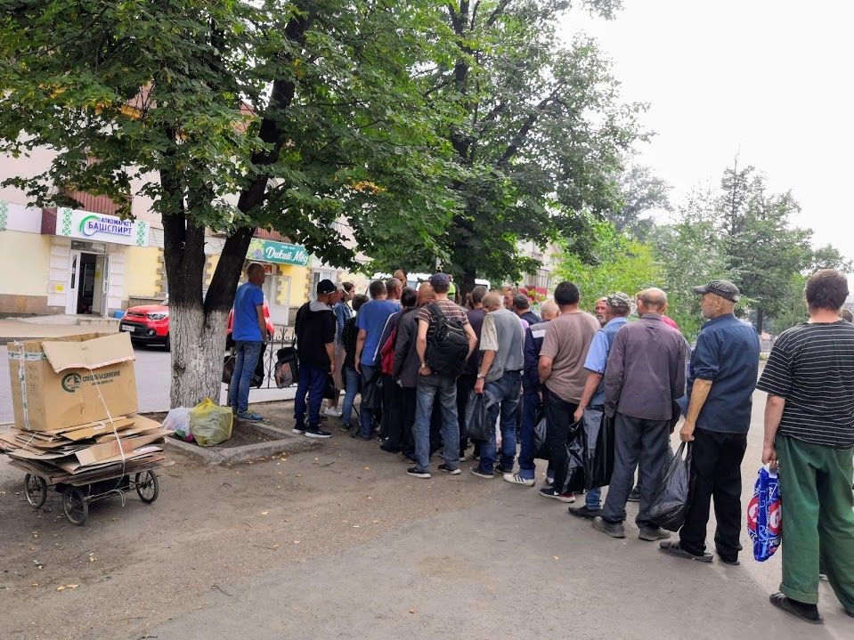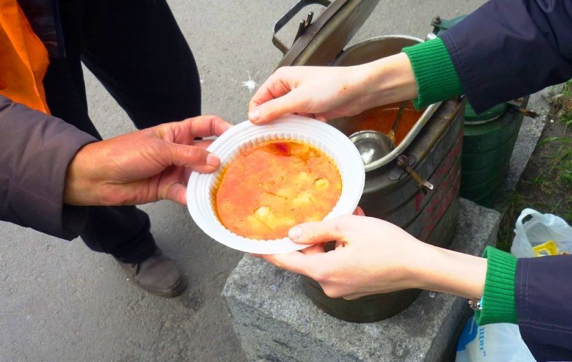 Перед едой как всегда читаем молитвы. Кто то снимает кепку, кто-то, закрыв глаза, шепчет то ли молитву, то ли просьбы к Богу, некоторые складывают ладошки и молятся по-мусульмански, кто-то повторяет за нами слова молитвы. Потом обязательно просят помолиться «за тётьГалю». Она, приемщица бутылок, умерла несколько недель назад. Я уже наслышана, как часто она выручала многих из них, не давая умереть с голоду, опекала, приносила в стужу им варежки из дома… Добрая, хорошая женщина. Молимся о ней и начинаем раздавать суп и хлеб.