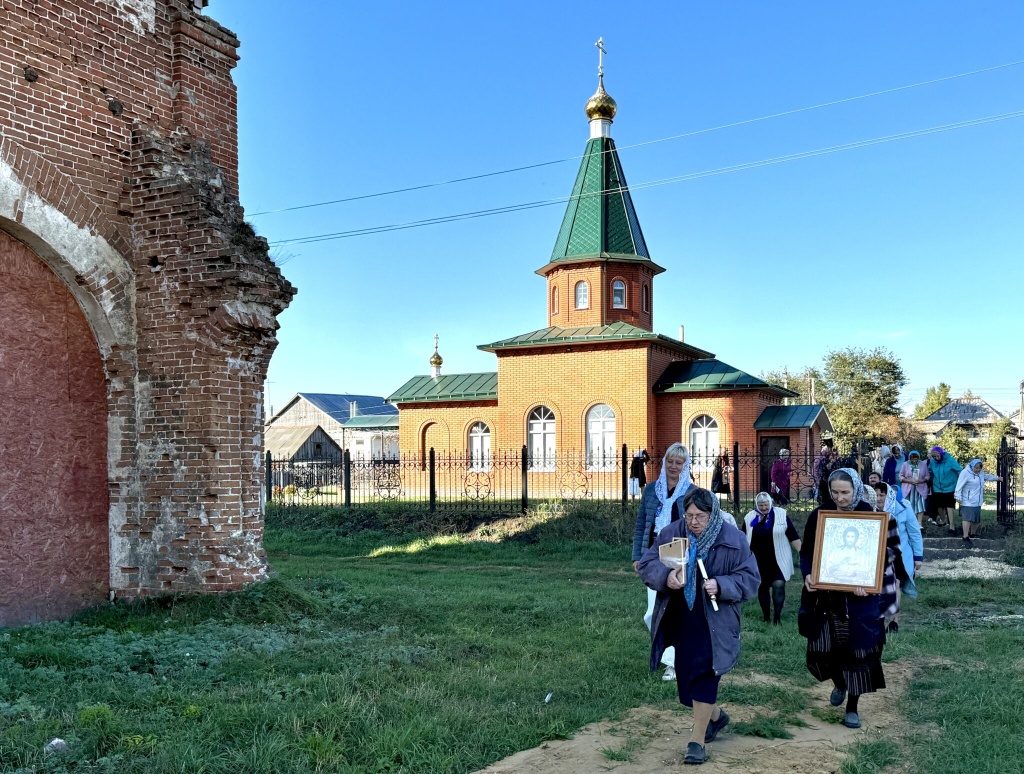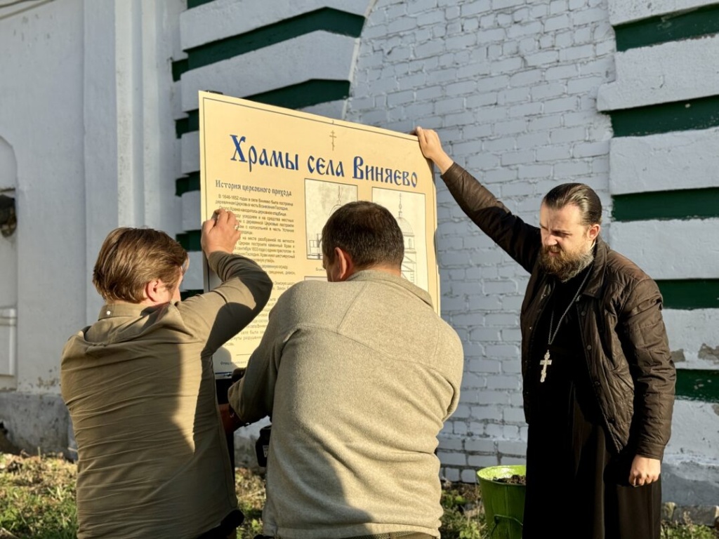 Стенд с информацией о храмах был установлен и в селе Виняеве, где рядом стояли две церкви: разрушенная Вознесенская, холодная, и действующий ныне Успенский храм. На прихрамовой территории иерей Александр Малкин совершил молебен и литию. Затем состоялся крестный ход вокруг святынь.