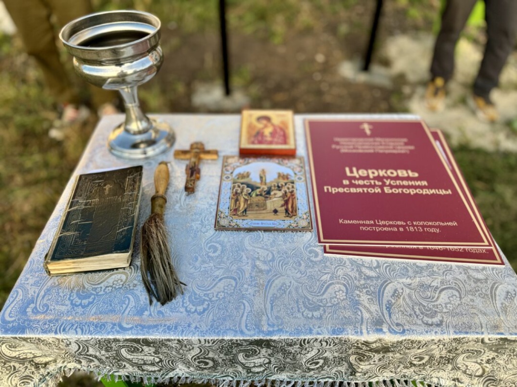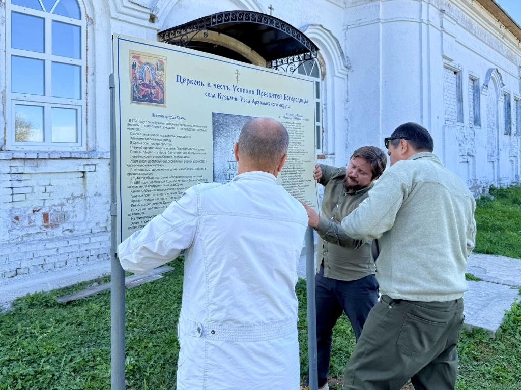 Первым селом, которое мы посетили, стал Кузьмин Усад. В старинном храме в честь Успения Пресвятой Богородицы был совершен водосвятный молебен. Затем состоялся крестный ход. Все это – в присутствии старосты храма и сельчан. По традиции около церкви был установлен информационный стенд с ее историей – главный подарок местным жителям.