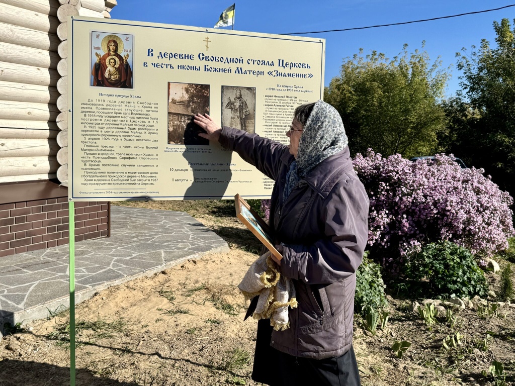 Следующим пунктом поездки стала деревня Свободная. До 1919 года она именовалась Майна и храма не имела. Молиться жители отправлялись в соседнее село Водоватово. А в 1918 году они возвели у себя, в полутора километрах от деревни, в лесной роще, деревянную церковь с колокольней. В 1925-м храм разобрали и перенесли в центр деревни Майна. 23 марта 1926 года церковь освятил благочинный Арзамасского округа протоиерей Иоанн Веселовский. В ней было два престола: главный – в честь иконы Божией Матери «Знамение» и придел в трапезной части во имя преподобного Серафима Саровского. На попечении находился молитвенный дом с богадельней в приходской деревне Макарьевка.