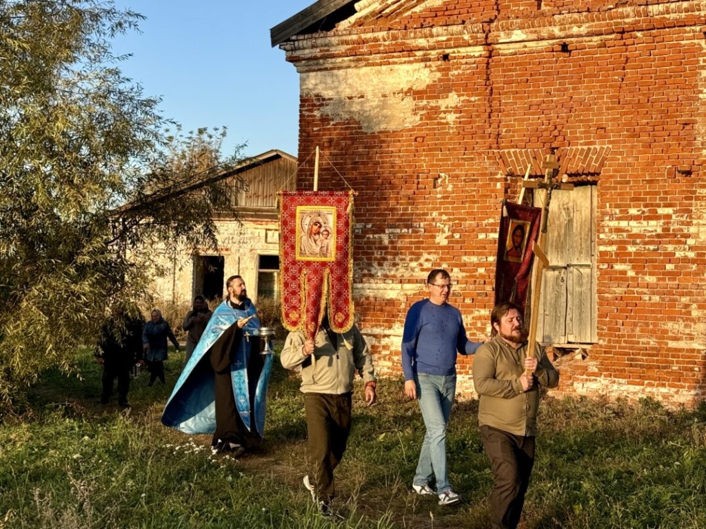 Далее нас ждал недействующий храм Нерукотворного образа Господа Бога и Спаса нашего Иисуса Христа в селе Слезневе. Информационный стенд около него был установлен ранее. В этот раз в руинированном храме иерей Антоний Балабанов совершил молебен и литию. Затем состоялся крестный ход вокруг всего храмового комплекса.