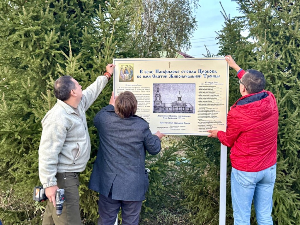 Последним пунктом поездки стало село Панфилово. Туда мы приехали уже затемно. Было решено установить информационный стенд на центральной улице местного населенного пункта, так как сам храм во имя Святой Живоначальной Троицы находится в отдаленной части села и в настоящий момент разрушен. Отец Александр совершил молебен.