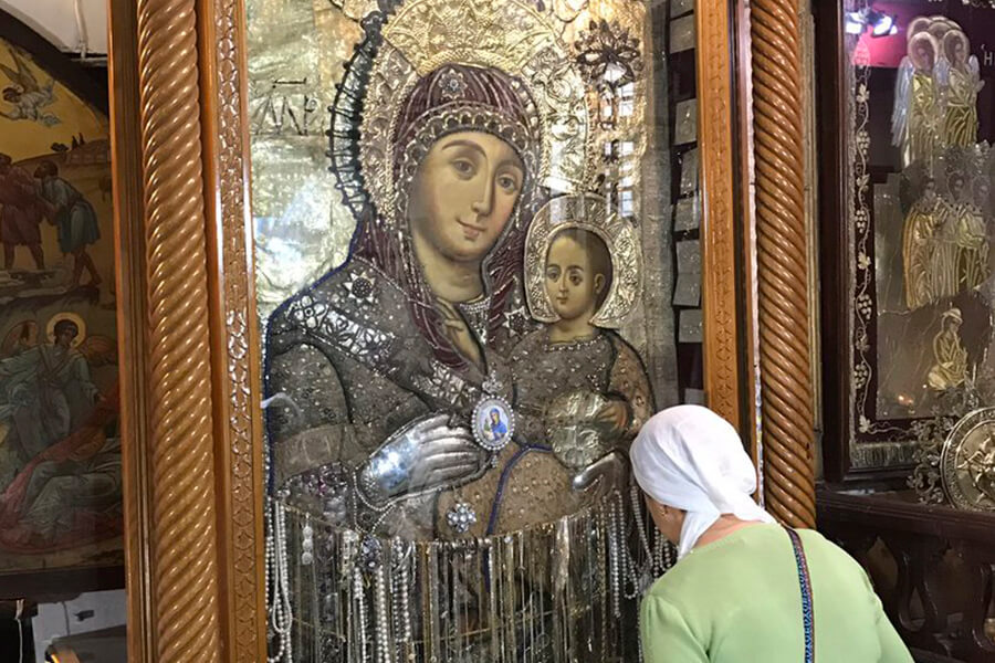 Впрочем, известна и икона, на которой Богородица улыбается. Это, к примеру, чудотворная Вифлеемская икона Божией Матери. Риза для этого образа, пожертвованного в базилику Рождества Христова, изготовлена из платья преподобномученицы Елисаветы Феодоровны. Образ относится к иконописному типу «Одигитрия», что значит «Путеводительница». Богоматерь указывает рукой на Спасителя как на Путь жизни.