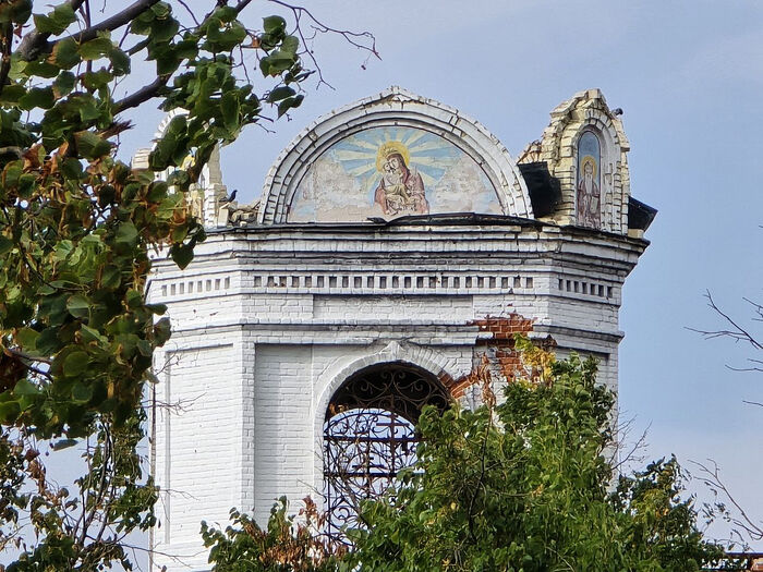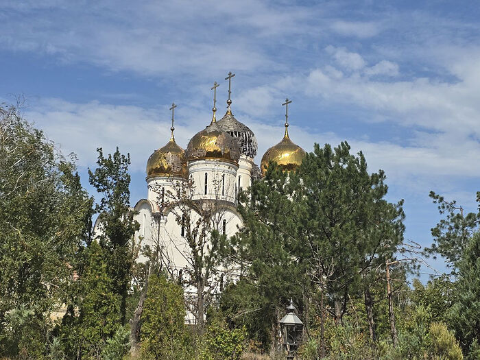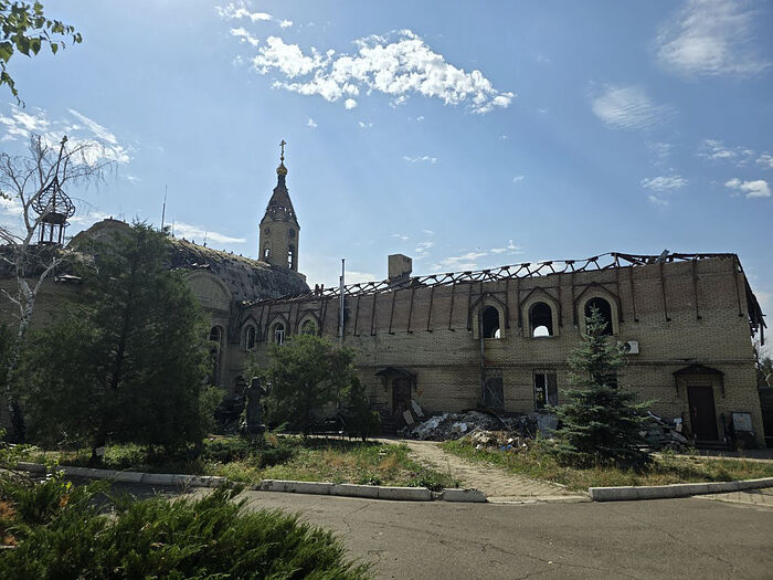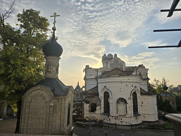 В день Успения в обители служили две литургии. Одна – ранняя в многострадальном соборном храме в честь Успения Пресвятой Богородицы, вторая литургия — в нижней церкви. Мы с руководителем общественной организации «Андреевский дом милосердия» Андреем Таныгиным решили, несмотря на усталость, пойти на раннюю службу. Там мы ещё не были на литургии, да и служилась она в соборном храме в последний раз на Пасху. Здание сильно пострадало от обстрелов: окна все выбиты, стены, большие купола сильно повреждены. От всего этого разрушаются не только стены, но и роспись, иконы на иконостасе. Насельники монастыря постоянно пытаются хоть что-то спасти, собирают воду после дождей… Хорошо, что лето выдалось очень сухое – хоть высушило немного стены сквозняками…