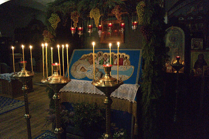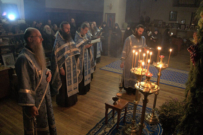 Так вот о литургии. Приготовили престол, семисвечник, принесли большое изображение Плащаницы Пресвятой Богородицы, совершили проскомидию. Начали утренние молитвы в четыре часа утра, прочитали часы, и началась литургия при свечах. Монахини пели очень слажено, без каких-либо сбоев и с великим благоговением. Литургию возглавил отец Никон. В том, как он служит, удивило, что он знает абсолютно все молитвы и читает их по памяти.