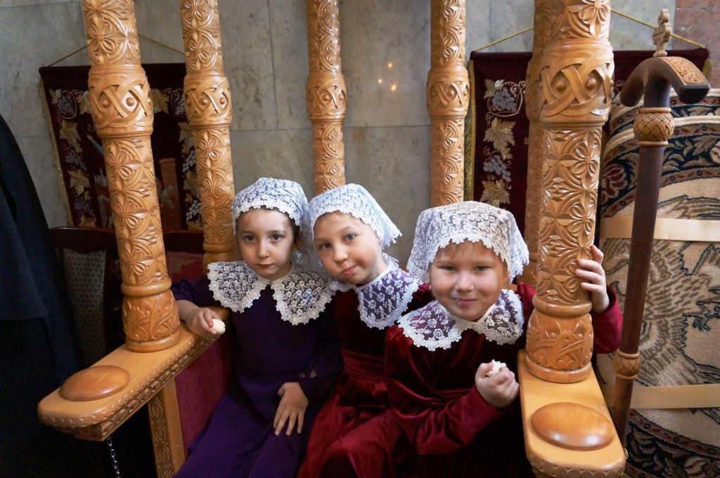 – Мы преподаем девочкам Закон Божий. По воскресеньям дети ходят в храм, сами поют литургию. Малышей водим в храм по субботам, когда народа бывает не так много. Дошколята тоже поют на клиросе. Больше стараемся воспитывать их личным примером.