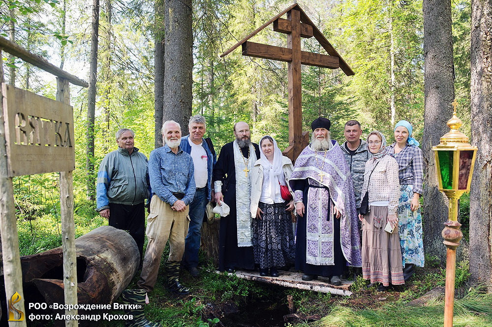 Меня и Александра в Яре посадили на дрезину, на которой везли большой крест, и мы пешком не шли (жалели, видно, мою старость). Прикатили нас к знаку «Исток Вятки», а оттуда уже со всеми шли по болоту, это километра полтора, самые трудные. Мне нашли сапоги, но иногда вода заливалась через голенища. Самые сильные несли огромный крест, иконы и хоругви, а всех остальных батюшка просил взять по камню, чтобы укрепить крест. Навсегда запомню мальчишку, который выбрал тяжёлый камень. Пожалев его, я сказал: «Возьми другой, полегче». – «Донесу», – ответил он. И когда шли по болоту, а это долго и трудно, проваливались в воду, насекомые тучами жужжали и кусали, я иногда оглядывался и видел, что мальчику тяжело: у него же руки заняты, а его тоже кусают, и не отгонишь этих кровососущих! Но он идёт и идёт, и даже подпевает молитвам. Дошёл миленький! Положил свой камень к кресту, напился и умылся из истока реки своей родины. Сел на траву, еле дыхание переводит, но радостно улыбается!