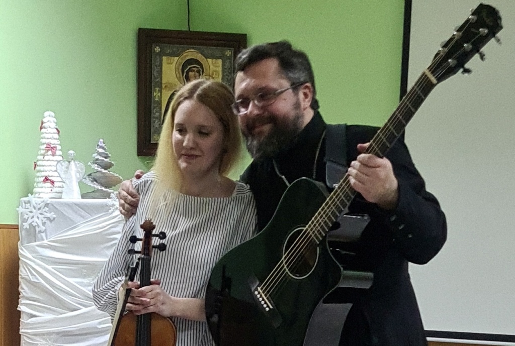С Софией у нас возник дуэт – скрипка и гитара. Софии было десять лет. Я тогда работал в духовной семинарии. Был период, когда мы с семьёй уезжали в город Ейск на постоянное место жительства. В семинарии была работа, был мужской хор, прихожане и коллектив, уезжать было трудно, и пришла в голову идея спеть песню Юрия Шевчука «Это всё». Там есть определённая мелодия, есть какие-то узнаваемые штрихи. Я написал ноты на скрипку, и мы с Софией репетировали. Я ей говорил: делай так, так, так. Чтобы это была не сухая композиция, а чтобы она была интересная, с каким-то развитием. И сложился этот дуэт. София играла достаточно виртуозно для своего возраста. Я увидел, что мы понимаем друг друга. Когда артисты переглядываются на сцене – это не только выражение симпатии друг к другу, можно какие-то знаки добавить. И всё, мы понимаем друг друга.