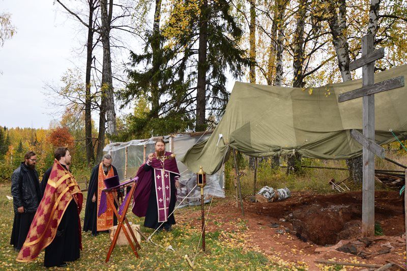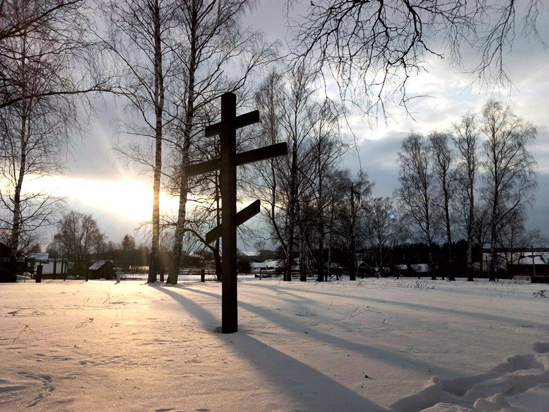 А вот на том месте, где стоял Никольский храм, за алтарем которого были погребены мокинские священномученики, мы снова были словно бы прощальным подарком одарены еще одним чудесным событием. Из-за серых темных туч, так часто нависающих над нашим краем, вдруг показалось солнышко и ярким лучом словно бы указало на крест, установленный на месте, где совсем недавно были обретены мощи священномучеников Павла Аношкина и Григория Смирнова.