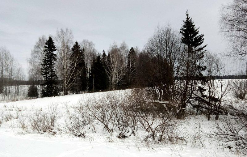 Поблагодарив за гостеприимство и радушие всех трех хозяек, мы поспешили, воспользовавшись уже совсем небольшим запасом отведенного нам времени побывать на том месте, где стоял Никольский храм, за алтарем которого были погребены священномученики Павел и Григорий. А перед тем добрались до Широкого лога – места их мученического подвига. Зимой к сожалению, с дороги не видно реку Березовку, но отчетливо и ясно заметен сам лог. По случайности или же по Божию промыслу в логу между рядами словно стеной стоящих деревьев перед нашими взорами предстала страшная картина: несколько поломанных, видимо, грозой и ветром деревьев, повалившись друг на друга, стали похожи на огромный кусок колючей проволоки, торчащей во все стороны. Будто сама природа говорила о том, что место это не простое.