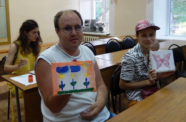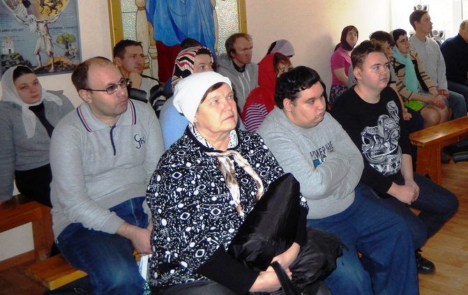 Там у них проводятся занятия: разучивают церковные песнопения, потом кто-то рисует, кто-то на лекцию идет. Отец Владимир радуется каждому нашему инвалиду, похваливает их, находит доброе слово.