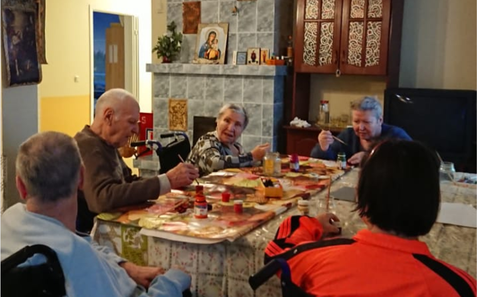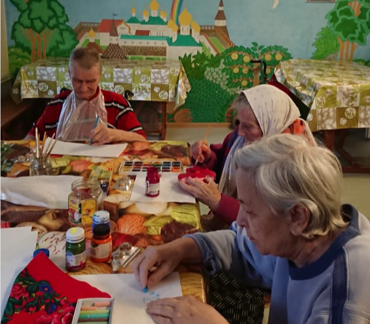 – У нас люди как с когнитивными нарушениями (память, мышление, сознание), так и с физическими (последствия инсультов, травм и тому подобное). Поэтому нужен многофакторный подход. Мы занимаемся эрготерапией, то есть восстановительной терапией для «физики». Простейшие упражнения оказались самыми действенными. Также мы используем арт-терапию, в частности, изотерапию. В наших условиях арт-терапия хороша тем, что в период занятия создаётся общность группы. Жители дома находятся на этой территории 24 часа в сутки. Мы как специалисты только периодически включаемся в этот процесс, а основная жизнь у них происходит между собой. Если мы сразу начинаем с рисования, то люди сами выбирают технику и материалы, кому что ближе: кому – карандаши, кому – акварельные краски, например. Это такой вход в групповую работу – у них происходит коммуникация между собой: люди начинают друг другу помогать, подсказывать.