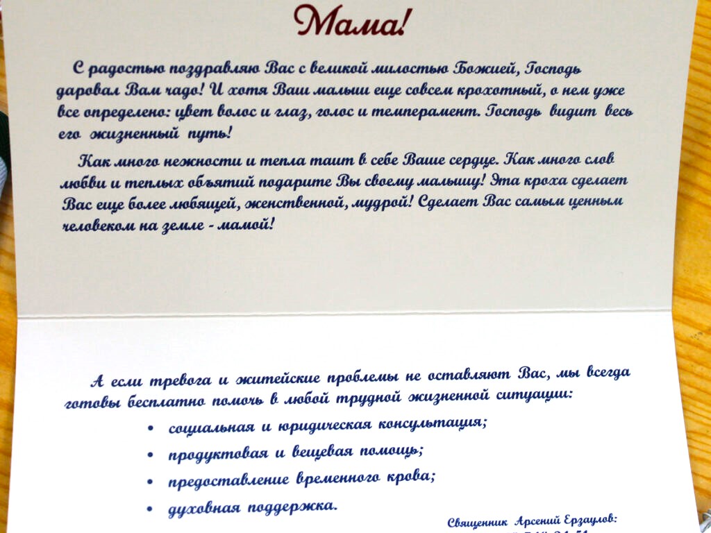 – Пинетки к нам приносят целыми коробками, — говорит Светлана Анатольевна. – Недавно отдала последние, а завтра утром из Покровского храма принесут еще. Кстати, женщины, которые сегодня получили пинетки и открытки с поздравлениями и предложением реальной помощи, будут рожать своих третьих детей.