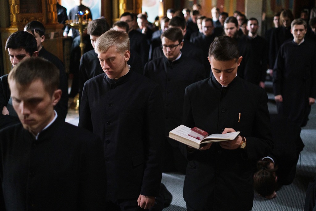 Для каждого студента Московской духовной академии период Святой Четыредесятницы является особенным. Эти особенности проявляются как с внешней, так и с внутренней стороны. Меняется рацион пищи: в трапезной подаются только постные блюда, но студентам делается послабление и разрешается рыба, ведь умственная деятельность – это их основное послушание. Особенно строгими днями является первая, четвертая, Страстная седмицы, а также среда и пятница каждой недели. Здесь семинаристы постятся по полной строгости и без рыбы. Но главный пост заключается в увеличении количества богослужений, на которые собирается вся академическая семья.