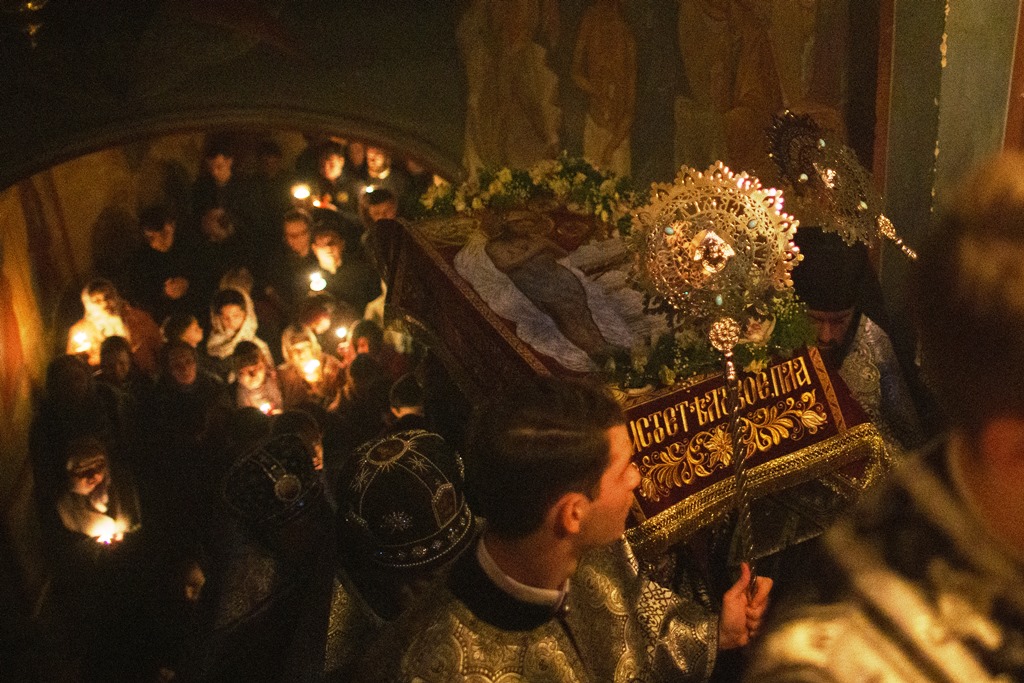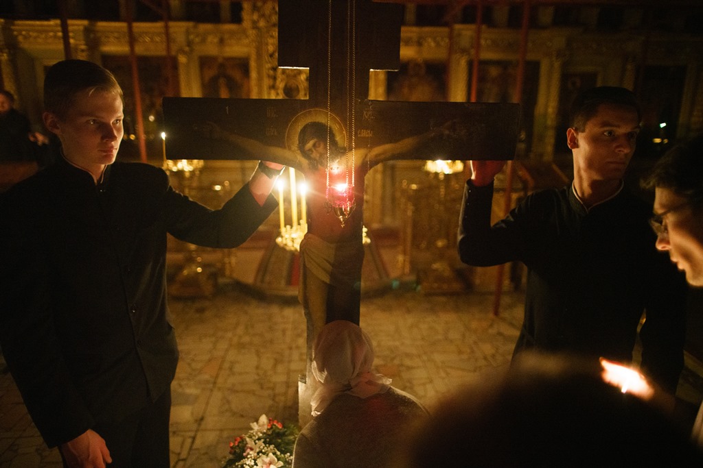 На следующий день, в Великую пятницу, все молятся за службами выноса Плащаницы и погребения Христа. С этим связана еще одна традиция Академии, которую очень любят студенты, – это дежурства у Плащаницы. Назначенные студенты следят за тем, чтобы возле нее всегда горел фимиам, горела свеча, а сама святыня содержалась в чистоте и порядке и верующие могли ей поклониться.