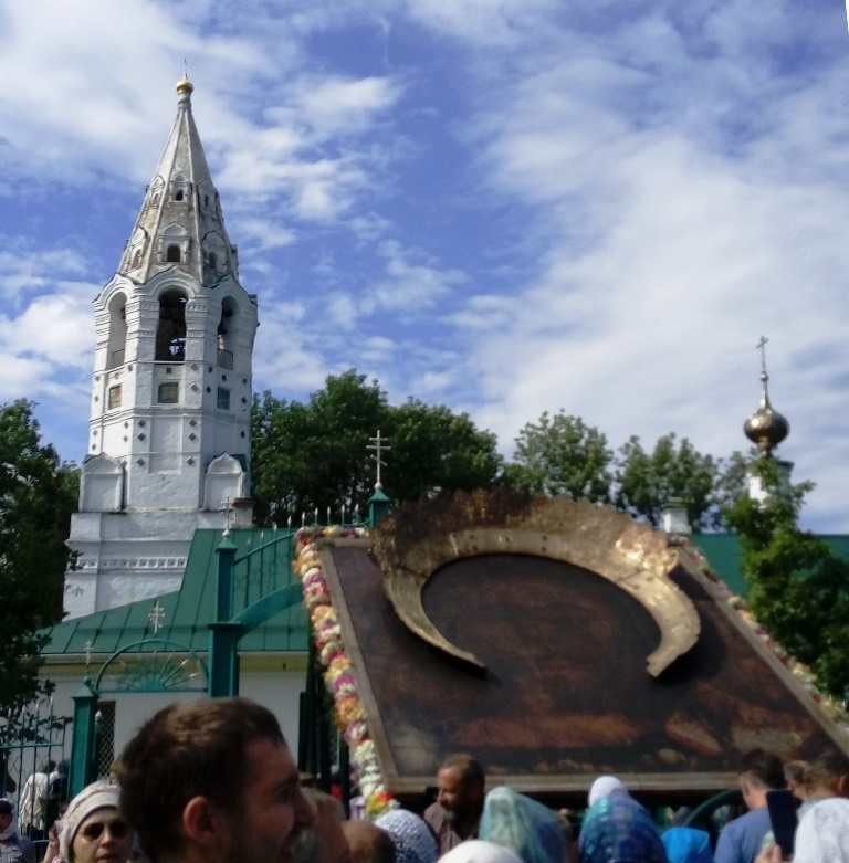 Это крайне тяжелое и технически сложное движение с бесценной иконой, конечно, невозможно никак объяснить рационально, это абсолютная сказка – святыня шествует по городу. На специальных мощных носилках икону перемещают в течение всего дня около двадцати могучих мужчин… На остановках у храмов, у источников и у кладбища, где похоронен архимандрит Павел (Груздев), служатся молебны, а тутаевцы и приезжие паломники не только прикладываются к иконе, но и проходят под ней. Проходящие под образом люди, непрерывное пение хора священников и мирян, передвижная звонница на грузовичке, звуковая аппаратура в тележке… и юноши, разбрасывающие цветы и траву, устилая дорогу Спасителю, как это было при Его входе в Иерусалим… Город напоен пением, звоном, ароматом ладана… Говорят, что некоторые жалуются, что плохо видят лик Христа на царь-иконе… А кто видит, трепещет от силы и выразительности этого образа, величественного и грозного.