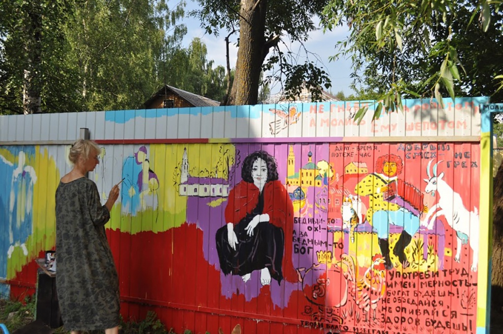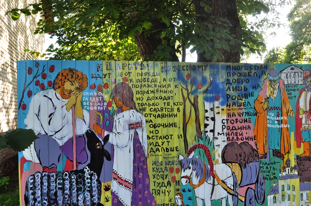 Счастье и везение Музея духовной истории состоит еще и в том, что сама Ольга Мотовилова-Комова нашла время и силы сделать монументальную роспись и на его ограде. И вот у нас на глазах тусклая унылая поверхность железного заграждения превращается в искрящуюся красками и добрыми, точно отобранными сюжетами, панораму Романова-Борисоглебска – сказочного, мифологизированного городка, в квинтэссенцию русской души, ментальности!