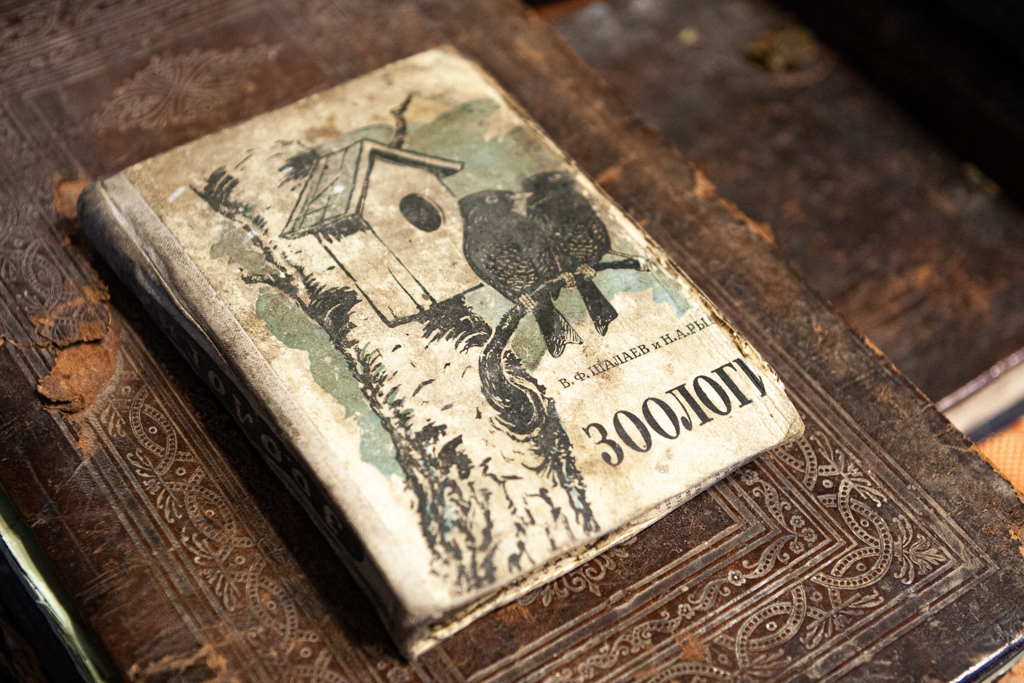 Наконец, интереснейший экспонат советских безбожных лет: молитвослов, спрятанный под переплетом школьного учебника зоологии. Его отец Сергий тоже нашел в куче мусора, оставшейся от прежних хозяев его дома: