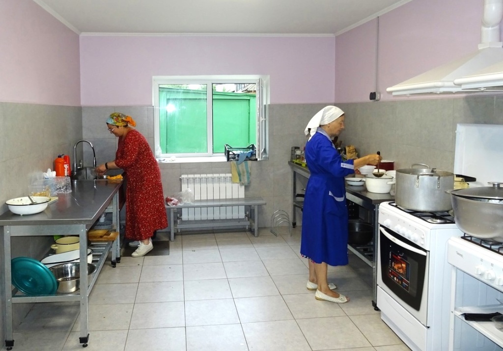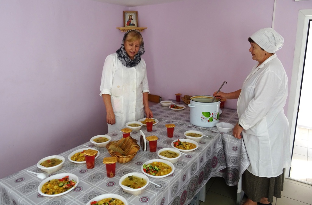 На кухне дружно трудятся добровольные помощницы: моют овощи, усердно стучат ножами, нарезая салат, что-то помешивают на большой сковороде и в огромной кастрюле. На просьбу рассказать о своей работе отвечают: «Здесь душа отдыхает».