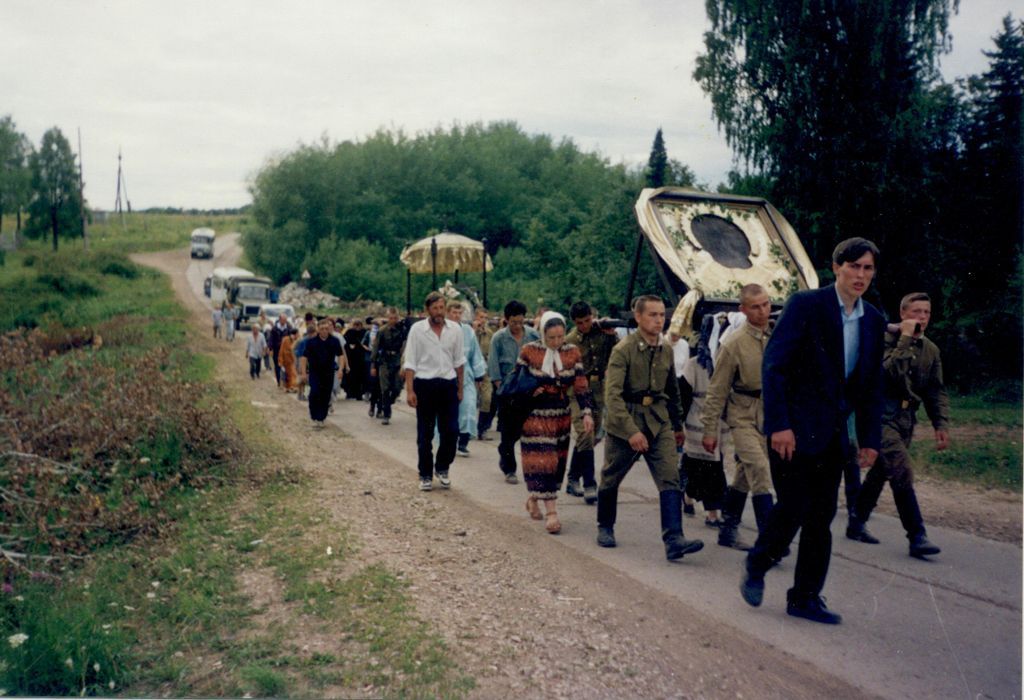 – 26 июля 1996 года после совершения Божественной литургии одновременно из трех храмов Перми вышло три группы паломников, которые в дальнейшем соединялись в районе ЦУМа. Первая группа отправилась от Свято-Троицкого кафедрального собора, вторая – от Петропавловского собора, а третья – из храма Казанской иконы Божией Матери Пермского Успенского женского монастыря, где в тот день я совершал литургию.