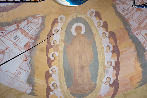 Само пространство в храме в честь иконы Божией Матери «Всецарица» станет «говорящим». Так, по вертикали, сверху вниз, идет тема жертвы Бога для человека: изображение Господа с чашей; в подкупольном пространстве – такие сюжеты, как небесная литургия, сошествие Святого Духа на апостолов, Богоматерь, несущая младенца Спасителя, как жертву. Пространство между ними – это элементы Нового Иерусалима. Заканчивается все Раем. А по горизонтали – жертва человека Богу: введение во храм Пресвятой Богородицы; Сретенье Господне; жертвоприношение Авраама; сюжет с Каином и Авелем – в арках ниже.