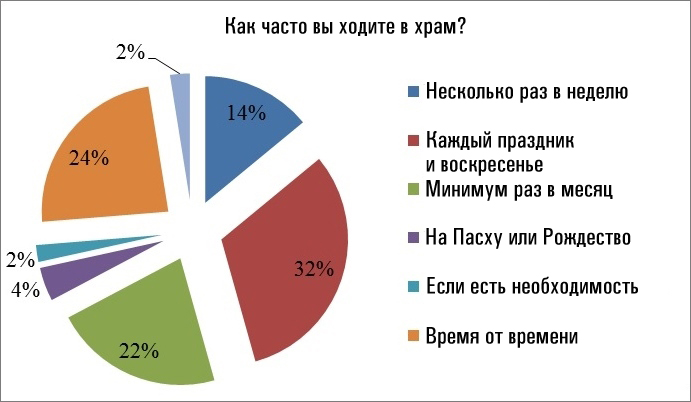 Большинство людей ходят в храм, как и полагается, каждый православный праздник и воскресенье. Но на втором и третьем месте ответы менее приятные – раз в месяц или время от времени. Значит, всё, что написано выше, – всё про нас, про наших друзей, знакомых, близких. И у нас есть над чем подумать, есть о чем просить помощи Божией.