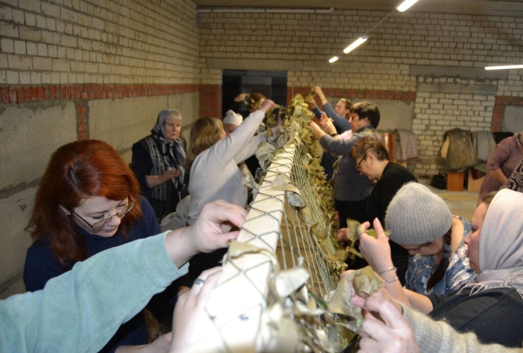 Приходы.ру 02.02.2024. 29 января исполнился год с момента, как на территории Никольского храма Заволжского района Ульяновска начали свою деятельность добровольцы, плетущие маскировочные сети для бойцов, находящихся в зоне проведения СВО. За это время более 120 человек приняли участие в добровольческой работе по плетению сетей и изготовлению блиндажных свечей.