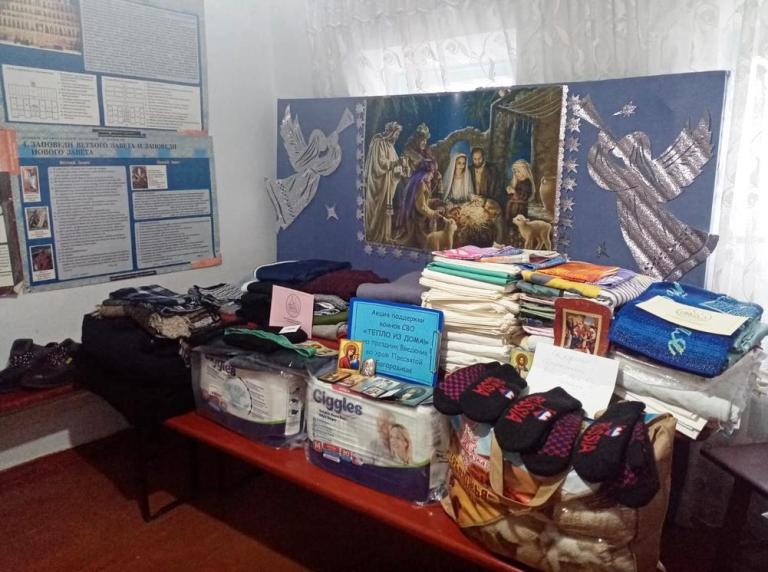 На передовую были пожертвованы тёплая одежда и обувь, тёплые носки, подгузники для взрослых, нижнее и постельное белье, банные полотенца, подушки и одеяла, мёд, чай и сладости, а также иконы для пациентов Донецкого военного госпиталя, сообщил 5 декабря 2024 года сайт Ейской епархии.
