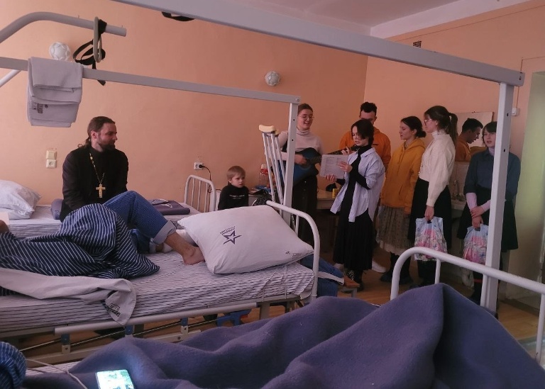 Священник и прихожане навестили солдат в палатах, где под гитару пели песни, общались с бойцами и дарили им небольшие подарки, сообщается на странице Владимирского прихода в социальной сети «ВКонтакте». Тёплые слова поддержки, концерт и пожелания скорейшего выздоровления подняли дух раненых защитников.