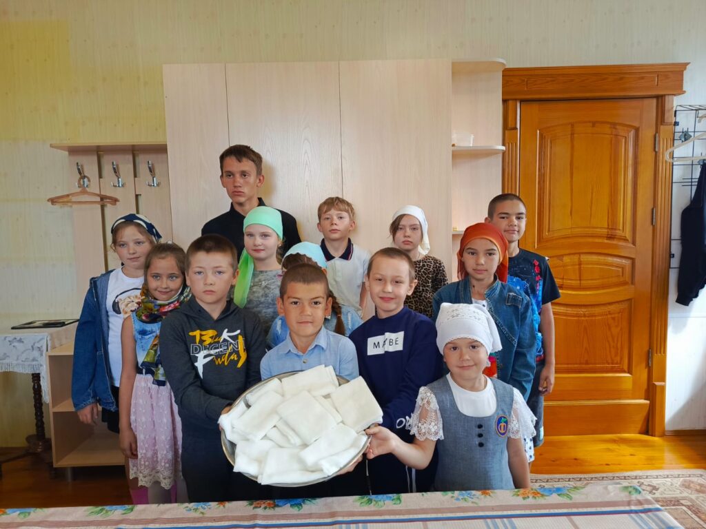 Приходы.ру 15.08.2025. Взрослые прихожане и воспитанники воскресной школы храма Покрова Пресвятой Богородицы села Алтайское приняли участие в изготовлении из марлевой ткани салфеток для нужд военных госпиталей, в которых проходят лечение участники специальной военной операции.