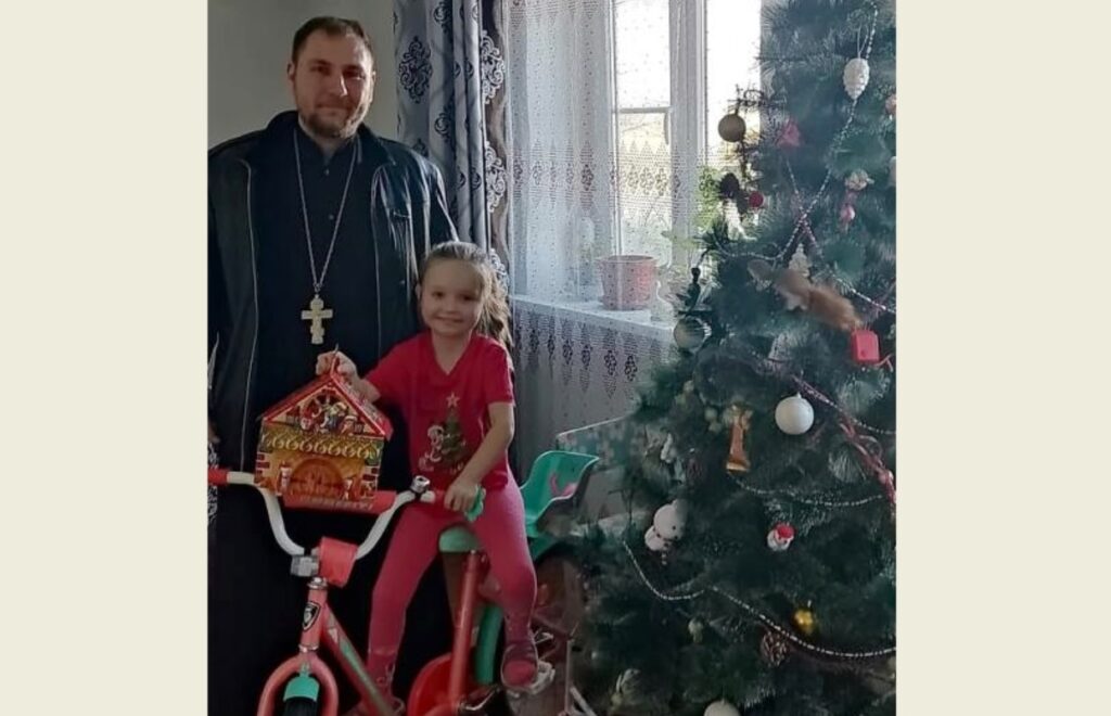 В качестве праздничного подарка батюшка вручил ребенку велосипед, а также набор сладостей.