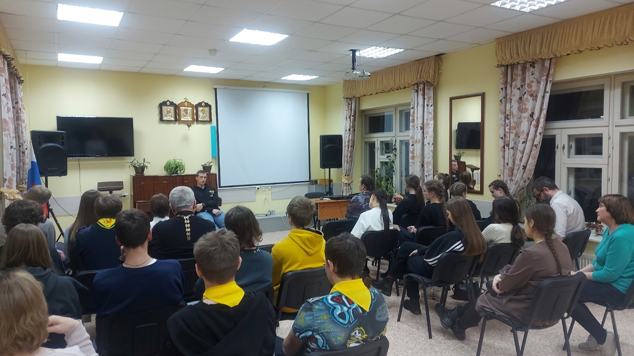 Приходы.ру 21.03.2024. 14 марта 2024 года в Духовно-просветительском центре «Соборная горка» Воскресенского собора Череповца (Вологодская область) прошла встреча с участником специальной военной операции. Выпускник воскресной школы и Дружины юных разведчиков «Череповец», в настоящее время проходящий военную службу, рассказал ребятам о своей жизни, о воинском служении, а также о том, как относятся к вере в зоне боевых действий.