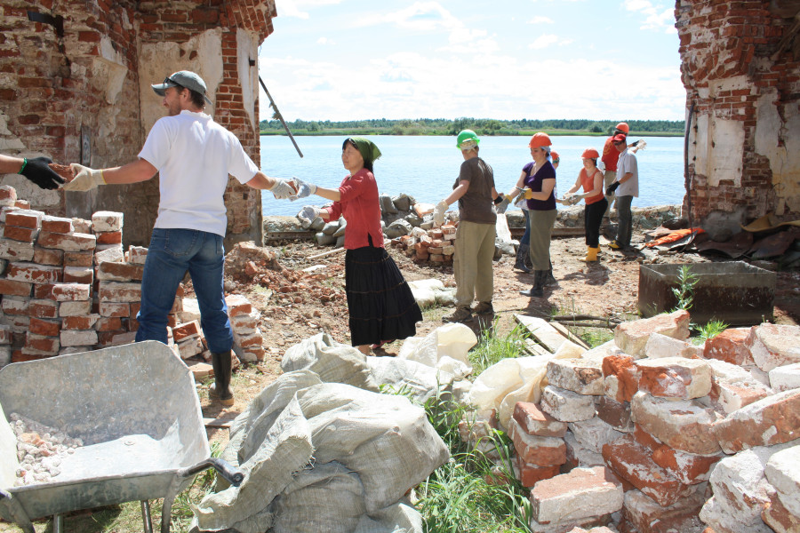 А тогда, тринадцать лет назад, первое, что нужно было сделать на храмовом острове, – разобрать завалы битого кирпича и восстановить кладку подмытых стен. Первые несколько лет все это делалось вручную: кирпичи передавали друг другу по цепочке, цемент возили на тачке. Но чтобы спасти здание от дальнейшего разрушения, предстояло оградить его от воздействия речных волн и мощных шекснинских ледоходов, когда в узкое «горлышко» истока Шексны направляется весь лед из Белого озера.
