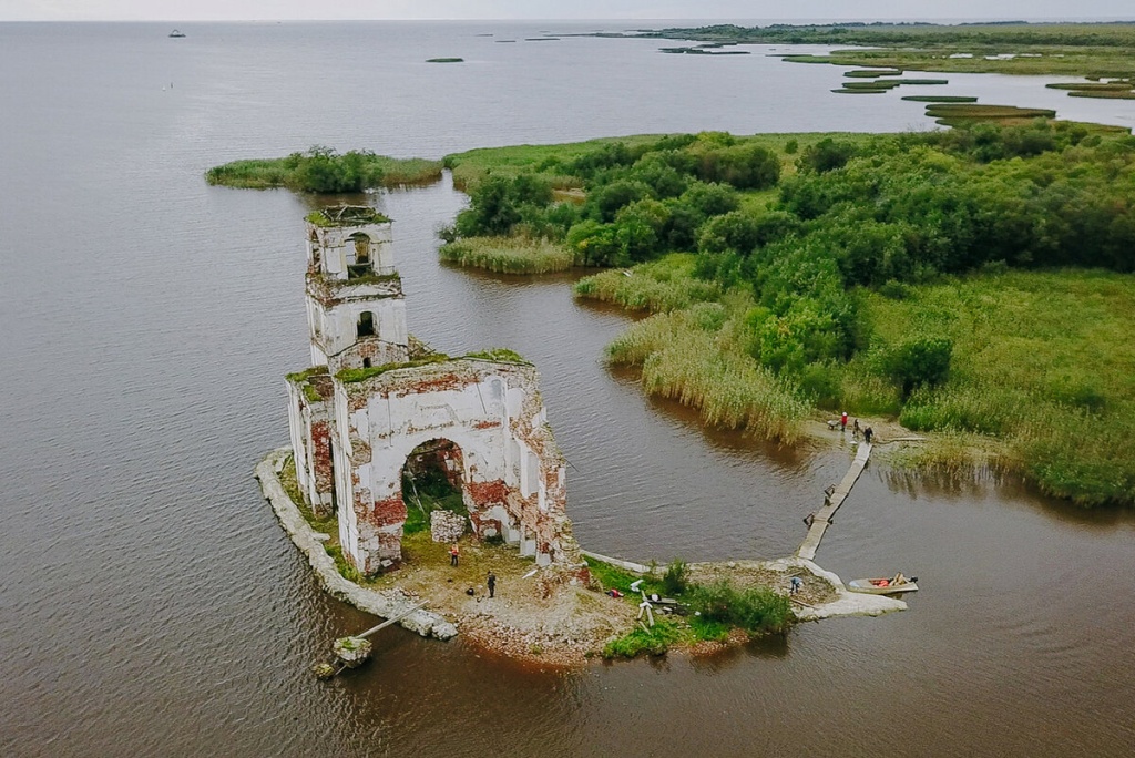 Этот остров гарантировал храму защиту от воды, что позволило проводить дальнейшие работы по сохранению здания. Так, летом 2023 года были проведены масштабные консервационные работы на колокольне – наиболее хорошо сохранившейся части храма-маяка. Восстановлены межэтажные деревянные перекрытия и лестницы, оконные и арочные проемы закрыты ударопрочным литым поликарбонатом, возведена металлическая консервационная кровля, на ней установлены молниезащита и солнечная батарея.